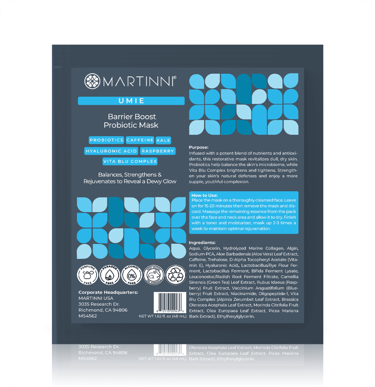 Revitalize dull and dry skin with our Barrier Boost Probiotic Mask. Infused with a potent blend of nutrients and antioxidants, this restorative mask revitalizes dull, dry skin. Probiotics help balance the skin’s microbiome, while Vita Blu Complex brightens and tightens. Strengthen your skin’s natural defenses and enjoy a more supple, youthful complexion.